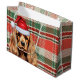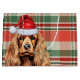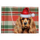 Comme ce Cocker Spaniel est mignon dans son casquette Père Noël rouge contre un grand arrière - plan à motif plaid saisonnier rouge et vert, ce sac cadeau de saison de vacances est parfait pour la maman Cocker ou l'amoureux des chiens.
