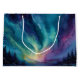 This whimsical gift bag features Aurora-like swirls of teal, violet, and gold over a reflective lake with silhouetted pines - a dreamlike cosmic landscape evoking wonder and renewal. Finished as an oil acrylic paint art print.