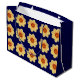 Glamorisez votre cadeau avec ce grand sac cadeau qui contient l'image d'une fleur Dahlia jaune sur un arrière - plan bleu marine et imprimé dans un motif extensible. La couleur de la garniture de sac est une couleur bleue assortie. Un design floral et amusant ! Sélectionnez un style brillant ou mat.