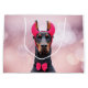 Doberman Pinscher chien de race noire et brune portant des cornes de diable rose vif sur un bandeau rose et un cravate rose. Placez-vous sur un arrière - plan à flammes rose.