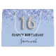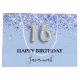 Élégant, classique, glamour et girly pour une Soirée Sweet 16, 16e anniversaire. Un arrière - plan tendance bleu bébé, bleu clair. Décoré avec de la poussière de parties scintillant imitation. Personnalisez et ajoutez un nom. Avec le texte : Joyeux anniversaire. Le nom est écrit avec un script de style moderne écrit à la main. Le numéro 16 est écrit avec une police de style ballon.