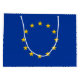 Ce dessin présente le Drapeau de l'Europe (ou Drapeau européen), symbole officiel utilisé par deux organisations distinctes, le Conseil de l'Europe (CoE) et l'Union européenne (UE). Il se compose d'un cercle de douze étoiles dorées à cinq branches sur un arrière - plan bleu azur. Le drapeau a été conçu pour la première fois en 1955, et il a été officiellement adopté plus tard cette année-là par le Conseil de l'Europe comme symbole de l'Europe toute entière. Le Conseil de l'Europe l'a exhortée à être adoptée par d'autres organisations européennes et, en 1985, les Communautés européennes l'ont adoptée ; l'UE a également hérité de l'utilisation de l'emblème lors de sa création en 1993.
