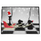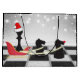 Ce drôle de sac cadeau de Noël d'échecs a été conçu avec Père Noël traîneau et rennes de . Le Père Noël est l'échiquier du roi portant un chapeau de Père Noël et les rennes sont deux pièces d'échecs du chevalier. Ils sont sur un échiquier devant une scène de neige hivernale avec des lumières de vacances.