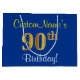 Grand Sac Cadeau Elégant, Bleu, Faux Or 90ème Anniversaire + Nom
