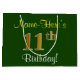 Grand Sac Cadeau Elégant, Vert, Faux Or 11ème Anniversaire + Nom