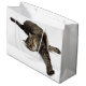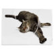 Tabby cat gris posé sur le sol s'étirant sur un arrière - plan blanc