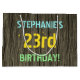 Ce modèle de sac cadeau d’anniversaire amusant comporte un message comme "23e anniversaire de STEPHANIE!", où le nom peut être personnalisé. L'arrière - plan présente un motif rustique, brun, imitation bois de grain. Le texte du message personnalisable est composé de couleurs comme le bleu, le jaune et le vert, et il a un aspect inspiré de celui du lettrage peint et recouvert de pochoirs. Un sac cadeau sur le thème de l'anniversaire comme celui-ci pourrait être une façon stupide de donner un cadeau à quelqu'un qui célèbre son vingt-troisième anniversaire. [~Z0000319]