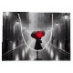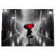 Une femme avec un parapluie rouge marche dans une rue de la ville, sombre et pluvieuse, éclairée par de vieux lampadaires.