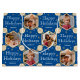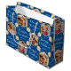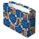 Faites vos cadeaux de vacances extra spécial avec un sac cadeau photo personnalisé! Ce modèle modifiable est personnalisé avec quatre de vos photos préférées, et le nom du récipiendaire, votre nom de famille, ou l'année des fêtes. il comprend des cadres d'images hexagonales, mis contre un arrière - plan festif de flocons de neige et d'étoiles, ainsi que la phrase "Joyeuses fêtes". Un design élégant alliant typographie traditionnelle et design géométrique classique. Parfait pour les photos d'enfants, de famille, d'amis et d'animaux de compagnie ! Un sac cadeau tout-en-un motif, disponible avec un fini mat ou brillant. Couleurs imprimées : bleu, blanc et or.