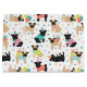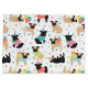 Cute birthday party Pug dogs with black and tan coats dressed in cute birthday outfits with balloons, cake and confeti pattern.