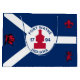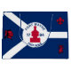 Grand poison Bag with flag of city of Fort Wayne, Indiana; blue and white flag and with red blockhouse in the center and three illustrations in the blue field - illustration of Native American’s head, French fleur-de-lys et British lion