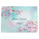 Un joli cerisier rose fleurit sur un arrière - plan de bokeh turquoise. Customisez-le avec un joyeux texte d'anniversaire et un nom dans une police élégante.