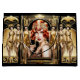 Une belle rousse Flapper fille porte un faux haut et un bandeau en or faux de l'épaule qui semblent briller et briller contre un arrière - plan noir. Elle porte un eyeliner noir épais et un rouge à lèvres foncé qui fait apparaître sa peau de porcelaine rayonnant dans la lumière et est encadré d'un cadre rétro, style art déco orné faux or cadre. Elle est accompagnée de trois danseuses de flapper glamour dans des robes en or satiné époustouflantes. Ils sont en train de monter sur une scène sur le point de danser toute la nuit. Ce design est idéal pour un "grand gatsby", "années folles", 1920 Flapper fille thème anniversaire, douche nuptiale, mariage ou anniversaire. Il est idéal pour les projets de découpage et de scrapbooking.