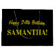 Un côté de cette conception simple et amusante de sac cadeau d'anniversaire a un grand numéro "24" avec un motif rose foncé et rayures rose clair. Le message d'anniversaire "Joyeux 24e anniversaire" et un nom personnalisé apparaissent de l'autre côté, tous deux en texte jaune. L'arrière - plan a une coloration noire. Un sac cadeau comme celui-ci peut être utilisé pour envelopper des cadeaux ou des cadeaux donnés en l’honneur du vingt-quatrième anniversaire de quelqu’un. [~Z0000378]