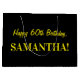 Un côté de ce design simple et amusant de giftbag à thème anniversaire a un grand nombre "60" avec un motif rose foncé et rose clair rayures. L'autre côté a le message d'anniversaire "Joyeux 60e anniversaire", et un nom personnalisé, tous deux en texte jaune. L'arrière - plan est noir de couleur. Des sacs-cadeaux comme celui-ci peuvent être utilisés pour envelopper des cadeaux ou des cadeaux donnés pour célébrer le soixantième anniversaire de quelqu’un. [~Z0000378]