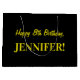Un côté de cette conception amusante et simple de sac cadeau d'anniversaire dispose d'un grand nombre "8" avec un motif rose foncé et rayures rose clair. Le message d'anniversaire "Happy 8th Birthday" et un nom personnalisé apparaissent sur l'autre côté, tous deux en texte jaune. L'arrière - plan est noir de couleur. Des sacs-cadeaux comme celui-ci peuvent être utilisés pour envelopper des cadeaux ou des cadeaux donnés en l’honneur du huitième anniversaire de quelqu’un. [~Z0000378]
