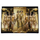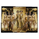 Flamboyantes filles tissant des mini-robes en faux or vibrantes qui brillent et brillent sous les scènes les lumières se produisent sur une scène qui a des accessoires de design art déco sur elle. Deux filles principales se présentent devant et sont extrêmement grandes et minces. Toutes les filles sont en or et les accessoires en noir et or. Ce design glamour et luxueux est idéal pour un "grand gatsby", "des années folles", 1920 Flapper fille thème anniversaire, douche nuptiale, mariage ou anniversaire. Il est idéal pour un usage professionnel ou personnel et est idéal pour un événement "noir et or" formale aussi.