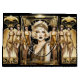 Une belle blonde cheveux Flapper fille porte un faux haut brillant et un bandeau en or qui semblent scintiller et briller contre un arrière - plan noir. Elle porte un eyeliner noir épais et un rouge à lèvres foncé qui fait apparaître sa peau de porcelaine rayonnant dans la lumière et est encadré d'un cadre rétro, style art déco orné faux or cadre. Elle est accompagnée de trois danseuses de flapper glamour dans des robes en or satiné époustouflantes. Ils sont en train de monter sur une scène sur le point de danser toute la nuit. Ce design est idéal pour un "grand gatsby", "années folles", 1920 Flapper fille thème anniversaire, douche nuptiale, mariage ou anniversaire. Il est idéal pour les projets de découpage et de scrapbooking.