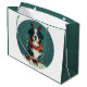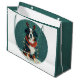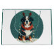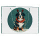 Cute illustration of a Bernese Mountain dog dressed as Santa Clause riding a bike. Perfect for pet lovers and dog parents during the holiday season.