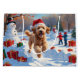 Un Goldendoodle moelleux court à travers la scène hivernale enneigée, portant un casquette de Noël rouge festif. Ce design animé met en valeur le manteau bouclé de la race, la nature affectueuse et la personnalité joyeuse tout en capturant l'esprit joyeux de la saison des fêtes. Un moment d'hiver plein de charme festif.