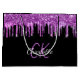 Un élégant fond noir orné de gouttes de fausses paillettes violettes et roses, aspect de peinture qui coule. Personnalisez et ajoutez une date, un nom et un âge. Un style de lettrage manuscrit moderne, lettres violettes. Parfait pour l'emballage de cadeaux ou les faveurs de fête pour les anniversaires, les douches de mariée et les baby showers.