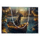 Jetez un coup d'oeil à la magie de la saison des Fêtes avec cette illustration magnifiquement détaillée, montrant un chien fier assis dans un bateau à la décoration festive, glissant à travers un lac serein de Noël. Les lumières scintillantes des pins voisins se reflètent dans l'eau, projetant une lumière chaude et festive qui renforce l'ambiance cosy. Des ornements pendent des côtés du bateau, tandis que des lanternes brillantes éclairent le chemin, créant une scène qui capture l'essence véritable de la chaleur et de la joie de Noël. Cette oeuvre nostalgique apporte une touche de magie de vacances à tout espace, parfait pour ceux qui chérissent l'esprit de la saison.