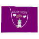 Un sac cadeau avec un adorable dessin d'une énorme licorne assise sur son cul paisible et heureux. Des nuages moelleux et un arc-en-ciel coloré au-dessus. Texte : Happy Vibes. Une merveilleuse positivité. Placé sur un arrière - plan violet rosâtre.