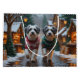 This festive design captures the joyful spirit of the holiday season, featuring an adorable dogs.Nestled in a winter wonderland, complete with a decorated Christmas tree, and beautifully wrapped presents. Snowflakes gently fall, adding a magical touch to the scene, while the vibrant colors of the holiday decorations create a warm and cheerful atmosphere.