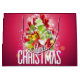 Sac cadeau avec un design graphique de Noël lumineux et festif. Le texte dit Joyeux Noël. Conçu avec un monticule de cadeaux en forme d'arbre avec des flocons de neige festifs, des étoiles, des baubles de noël et des étincelles à l'air brillant. Aiguilles de pin et illustration en forme d'arbre également inclus dans cette image de vacances. L'arrière - plan est une couleur rose rougeâtre vibrante.