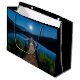 Un sac cadeau avec une belle photo d'une jetée en bois qui s'étire sur un lac calme. Ciel nocturne couvert d'étoiles et belle pleine lune.