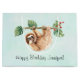 Sac cadeau avec un adorable paresse accroché à l'envers d'une branche d'arbre. La branche d'arbre est décorée de feuilles tropicaux et de baies. Placez-vous sur un arrière - plan vert clair.