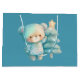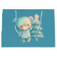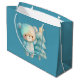 Sac cadeau avec une adorable illustration. Un ours douillet aux étoiles et aux étincelles dans sa fourrure. À côté d'un sapin de Noël. Couleur pastel bleu-vert. Whimsical et mignon.