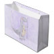 Sac cadeau avec une jolie illustration représentant un dinosaure gris violet.