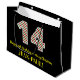 Ce sac cadeau amusant et simple thème de Noël et thème d'anniversaire Décembre 25e conception de sac cadeau d'anniversaire comprend un grand numéro "14" avec un motif à rayures vertes, blanches et rouges, ainsi que le message "Joyeux 14e anniversaire & Joyeux Noël", et un nom personnalisable. L'arrière - plan est noir de couleur. Un sac cadeau comme celui-ci peut être amusant à utiliser pour envelopper des cadeaux ou des cadeaux qui sont donnés à quelqu'un dont le quatorzième anniversaire tombe le jour de Noël (25 décembre). [~Z0000407]