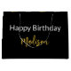 Le joyeux sac cadeau d'anniversaire est noir. Le nom du récipiendaire dans un faux script d'or et l'expression "Joyeux anniversaire" est au-dessus du nom. Le nom (Montré : Madison) apparaît dans un élégant faux (pas de feuille) script d'or. L'autre texte est blanc. Tout le texte peut être modifié.