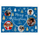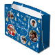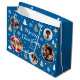 Faites vos cadeaux de vacances extra spécial avec un sac cadeau photo personnalisé! Ce modèle modifiable est personnalisé avec cinq de vos photos préférées, et le nom du destinataire, votre nom de famille, ou l'année des fêtes. Un design élégant avec des cadres en forme de cercle, dressés contre un arrière - plan à motifs. Il présente "Joyeux Noël" en typographie script, avec des motifs festifs d'arbre, de fleur de neige et d'étoiles — un mélange d'éléments traditionnels de Noël et de style moderne, avec des lignes simples et propres et des formes géométriques. Parfait pour les photos d'enfants, de famille, d'amis et d'animaux de compagnie ! Ce sac cadeau est disponible avec un fini mat ou brillant. Couleurs imprimées : bleu, blanc et or.