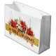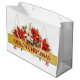 Joyeux Poinsettias Noël Grand Sac Cadeau. Un sac de Noël élégant et classique avec de l'aquarelle blanche et rouge Poinsettias sur un ruban doré orthographier Joyeux Noël en rouge. La base du sac est blanche, le rendant délicat et classique. Parfait pour vos cadeaux de Noël pour un emballage facile et élégant. Voir notre collection de Noël Poinsettia pour d'autres produits avec ce thème de design.