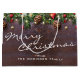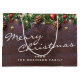 Sacoche cadeau de Noël sur mesure avec un arrière - plan en bois foncé, branches d'arbres de Noël festives, décorations d'arbres rouges et dorés, cônes de pin, et lumières à corde.