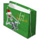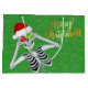 Ce sac cadeau est vert avec des taches d'or brillant et un squelette tenant des ornements brillants jusqu'à ses yeux en portant un casquette du Père Noël rouge avec Joyeux texte de Noël en or brillant sur le devant et le dos.
