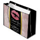 Sac cadeau de fête (ou autre événement) pour enterrement de vie de jeune fille avec un fond composé d'un motif moderne et tendance de feuilles tropicales or rose. Superposé par-dessus, un cadre noir avec une bordure dégradée or, à l'intérieur des lèvres pailletées roses.