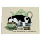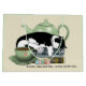 Un mignon chat noir et blanc qui dort sur un tas de livres avec une théière verte et une tasse de thé.