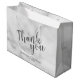 Classy Elegant Marbre blanc Wedding Favor Cadeau Sac avec titre "Merci" en gris police de caractères modernes avec nom et date dans police sans serif moderne sur arrière - plan en marbre blanc.