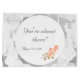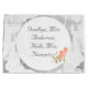 La conception comprend une image de fond de dentelle blanche et délicate. Le centre est blanc avec un texte personnalisable dans une police nuptiale de couleur argent. Le texte avant indique "Au revoir, Mademoiselle Anderson; Bonjour, Madame Flemming!" Le verso indique "Vous y êtes presque!" plus la date du mariage. L'image de roses pêche douces orne le bas. Parfait pour une fête de mariage.