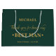 Sac cadeau personnalisé BEST MAN avec palette couleur vert émeraude et or. Le nom modèle est configuré pour que vous puissiez ajouter le nom du meilleur homme ainsi que les noms de la mariée et du marié et la date du mariage. Le texte de remerciement dit "Merci d'être mon meilleur homme" dans un mélange d'écriture élégante et de typographie forte et audacieuse. Parcourez notre magasin pour trouver des couleurs et des tailles alternatives.