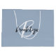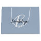 Ce sac cadeau personnalisé est doté d'un monogramme et d'un prénom en écriture moderne noir et blanc sur un arrière - plan bleu poussiéreux, avec le texte supplémentaire en police sans serif en noir ci-dessous.