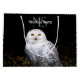 Portrait animal photo d'une majestueuse chouette enneigée debout sur une branche avec un nom personnalisé personnalisé monographie ci-dessus.