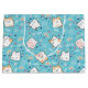 Un grand sac cadeau avec un motif de chat mignon, sur un fond bleu et décoré de arcs-en-ciel et d'empreintes de pattes et plus encore.