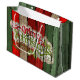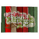 Belle étiquette de vœux de Noël unique, classique, tendance, jolie et décorative avec une citation 'Joyeux Noël' de couleur rouge foncé, vert forêt et blanc sur un fond de motif de planches de style cottage campagnard rustique.