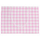 Cute baby girl lying on a pillow holding a teddy bear with a pink and white gingham background.