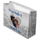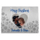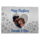 Faux arrière - plan d'argent. Décoré de flocons de neige. Personnalisez et ajoutez votre ou vos nom(s). Cadre photo en forme de coeur. Texte bleu.